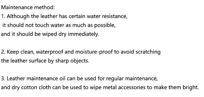 3. Leather maintenance oil can be used for regular maintenance, and dry cotton cloth can be used to wipe metal accessories to make them bright.